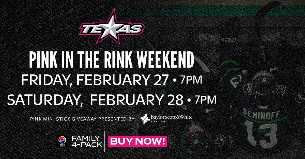 We are excited to host Pink in the Rink Weekend presented by Baylor Scott & White on February 27 and 28 at 7pm.