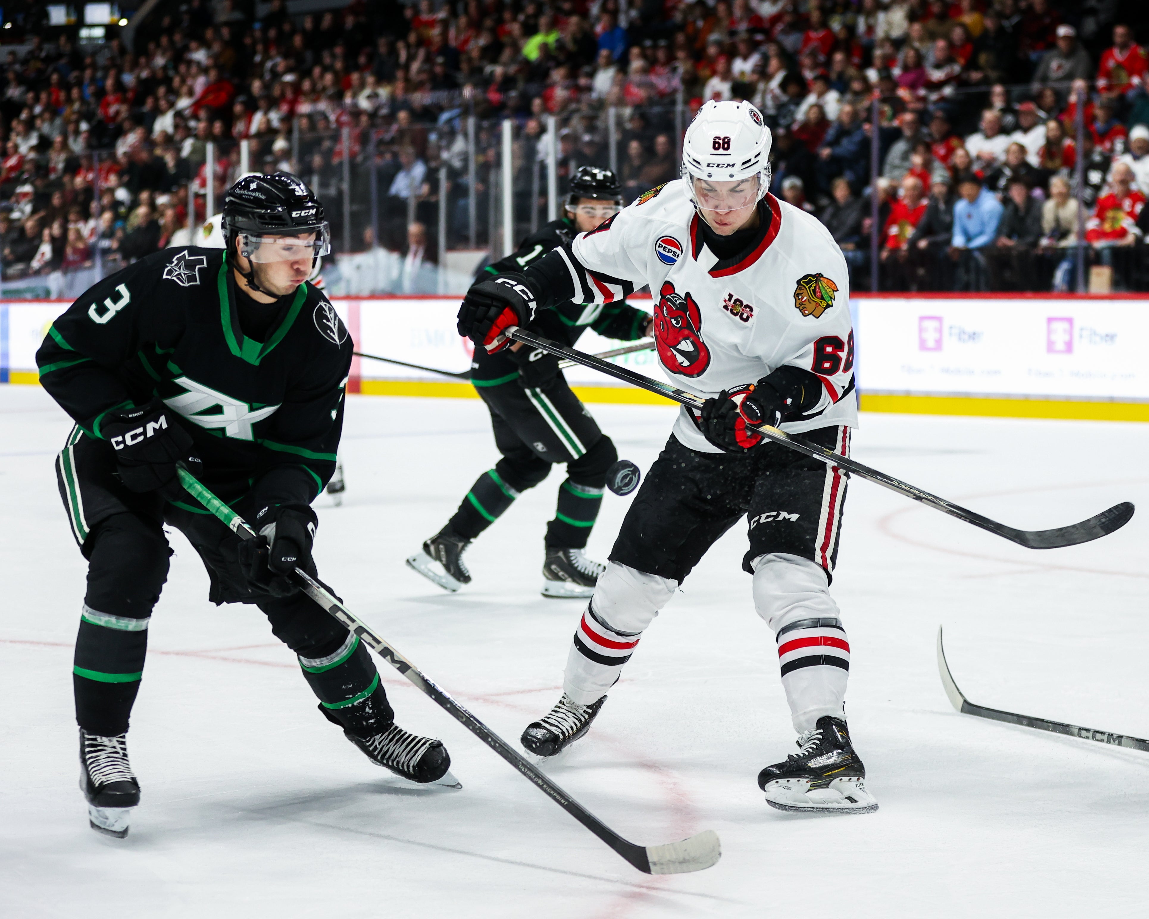 Seminoff, who turned 22 on Saturday, scored on the power play for his first career multi-goal game. Cameron Hughes fed the puck to Seminoff from high in the slot and the Stars forward netted the equalizer from the left faceoff circle. Tristan Bertucci received the secondary helper to extend his assist streak to six games. In the waning seconds of the period, Dmitry Kuzmin beat the buzzer to put Rockford back in the lead.