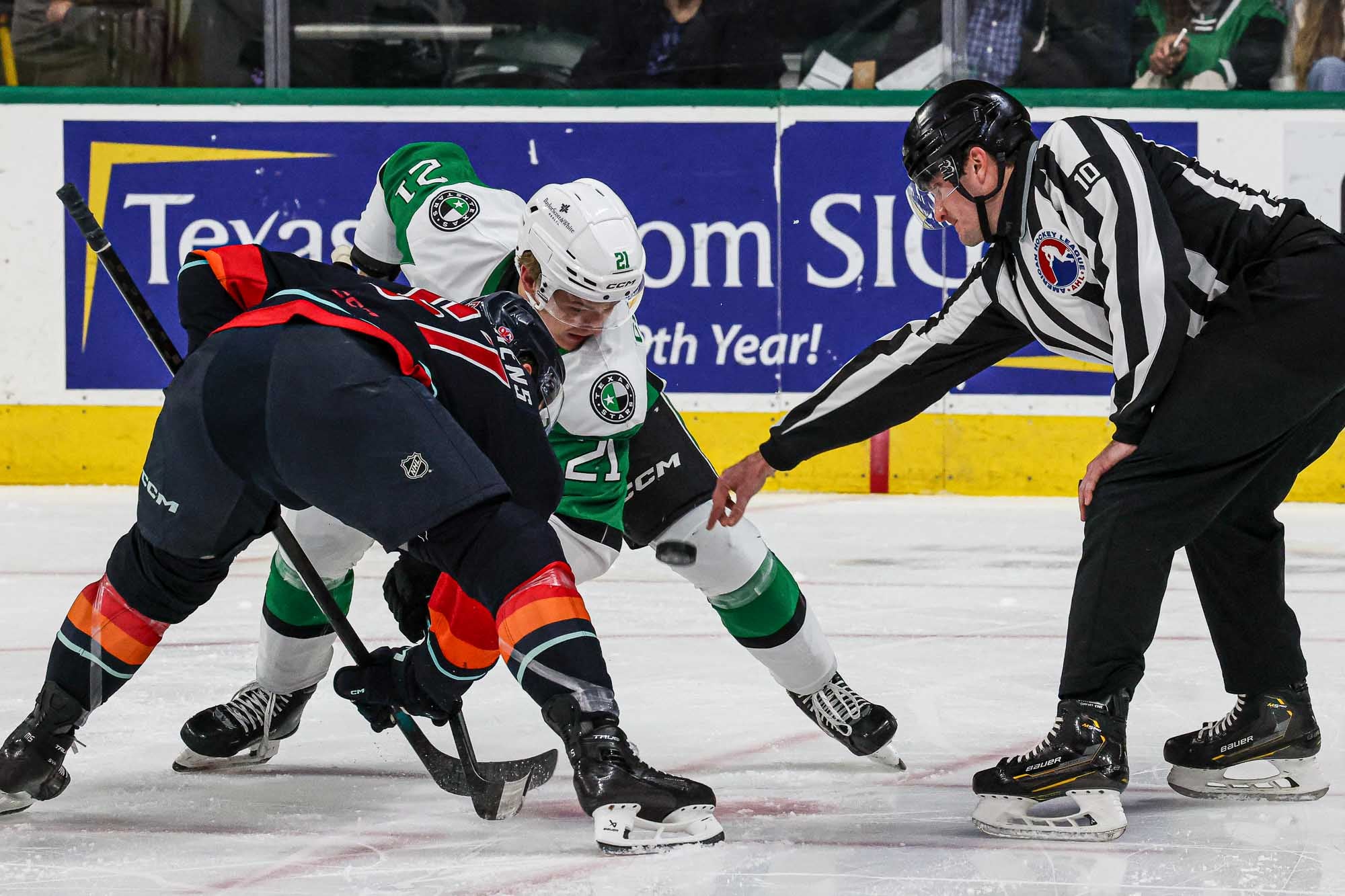 Caden Price scored the equalizer for the Firebirds on a point shot eleven minutes into the third period. Jani Nyman gave Coachella Valley the lead just a minute later when he lifted the puck over the blocker of Tiefensee. Texas pulled Tiefensee for an extra attacker, but the Firebirds chipped in two empty net goals to give the visitors the win 5-2.