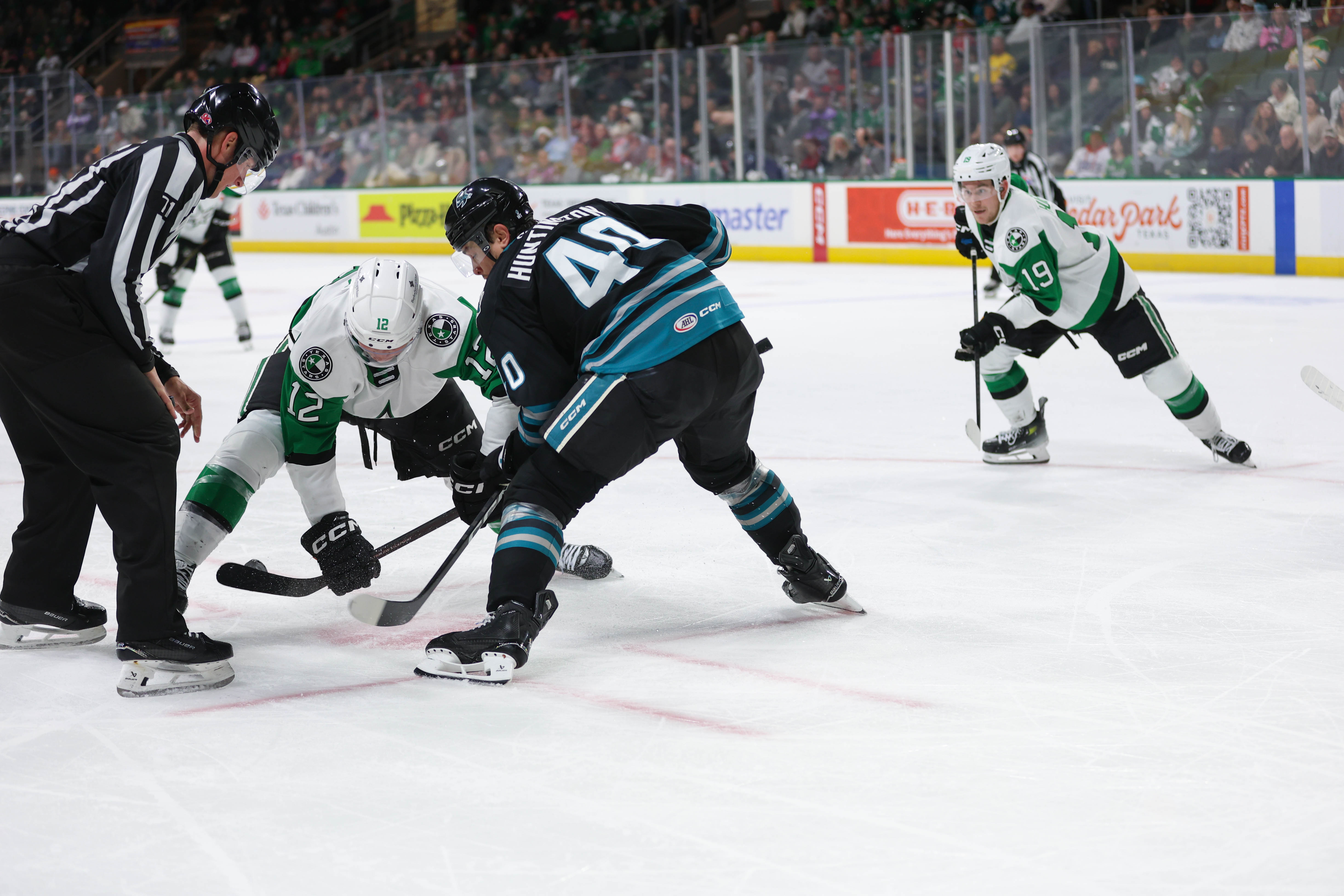 Texas opened the scoring early in the first period when Michael Karow scored on a one-timer from low in the left faceoff circle. The Stars held the lead for the next fourteen minutes until Filip Bystedt forced a turnover in the Barracuda’s offensive zone and sent the puck over the right pad of Remi Poirier to tie the game.